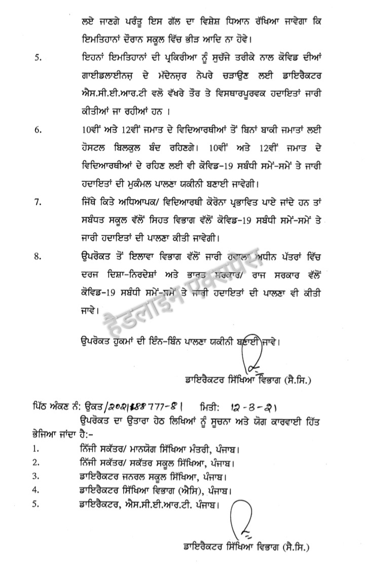 जालंधर, 12 मार्च 2021-(एच.ई)-पंजाब में कोरोना के बढ़ते मरीजों और स्कूली बच्चों के अभिभावकों के विरोध को देखते हुए शिक्षा विभाग ने आज दसवीं बारहवीं की क्लासों के विद्यार्थियों को छोड़कर बाकी स्कूलों को बंद करने के आदेश जारी किए हैं। इन आदेशों में साथ ही यह भी लिखा गया है कि एग्जाम ऑफलाइन ही होंगे।