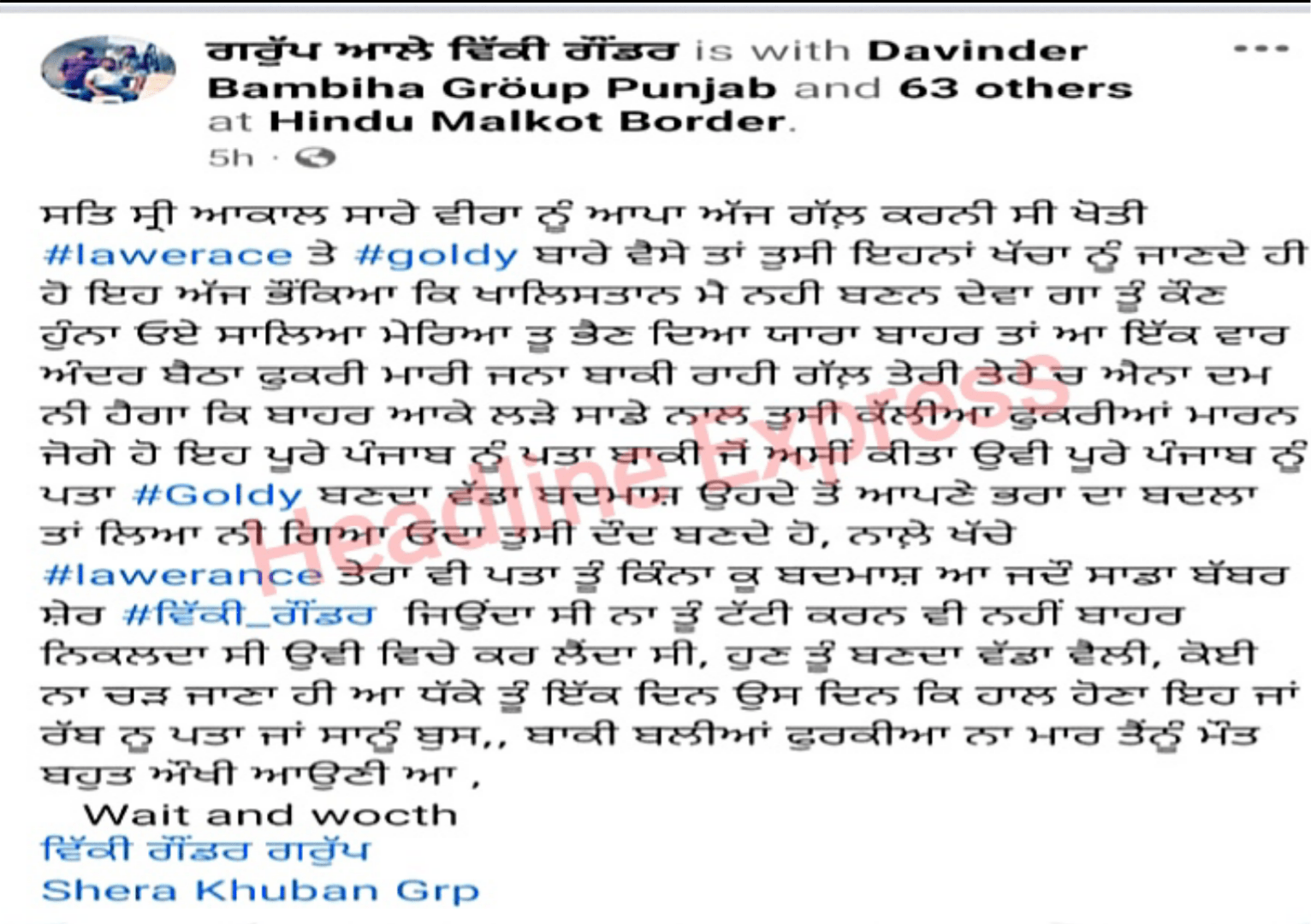 👉🏻 गैंगस्टरों ने सोशल मीडिया पर पोस्ट डाल कर लारेंस बिश्नोई और गोल्डी बराड़ को दी धमकी