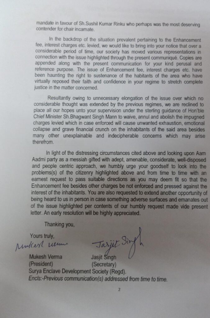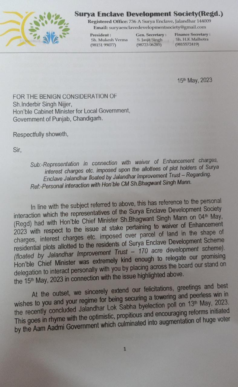 पंजाब के मुख्यमंत्री सरदार भगवंत सिंह मान जी ने सोसाइटी मेंबरों को भरोसा दिलाया था कि जल्द ही अगली बैठक चीफ सेक्टरी व निकाय मंत्री सरदार इंद्रजीत सिंह जी के साथ करवा कर इस मसले का हल करवाया जाएगा। आज चंडीगढ़ में पंजाब भवन सेक्टर 3 में बैठक करवाई गई। सोसाइटी मेंबरों ने मांग पत्र द्वारा अपनी समस्याओं से मंत्री जी को अवगत कराया। जिसमें सबसे प्रमुख समस्या इन्हासमेंट जो कि पिछले काफी समय से सूर्य एनक्लेव निवासियों का प्रमुख मुद्दा है और साथ ही बाकी समस्याएं जैसे कम्युनिटी हॉल, ग्रीन पार्क, गैस पाइपलाइन इत्यादि। इन सभी समस्याओं को सुनने के पश्चात निकाय मंत्री सरदार इंद्रबीर सिंह निज्जर जी ने समाधान जल्द से जल्द करवाने के दिशा निर्देश जालंधर इंप्रूवमेंट ट्रस्ट के चेयरमैन सरदार जगतार सिंह सिंह सघेड़ा और संबंधित अधिकारियों को इन्हासमेंट पर जल्द ही ओ. टी. एस स्कीम लाकर सूर्य एनक्लेव निवासियों को बड़ा लाभ देने का भरोसा सोसाइटी मेंबरों को दिया। हम इस बैठक में हमारी बातो, मुद्दों को इतनी अच्छी तरह से सुना गया और इसे हल करने का भरोसा दिलाया गया। हम पंजाब सरकार के मुख्यमंत्री सरदार भगवंत सिंह मान जी, निकाय मंत्री सरदार इंद्रबीर सिंह निज्जर जी का और हमारे सेंट्रल हल्का विधायक श्री रमन अरोड़ा जी एवं इंप्रूवमेंट ट्रस्ट के चेयरमैन सरदार जगतार सिंह संघेड़ा जी