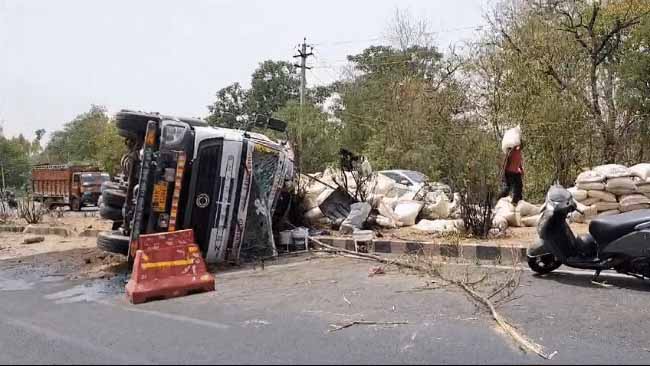 लुधियाना : नेशनल हाईवे फिरोजपुर रोड पर चावल से भरा ट्रक पलटा