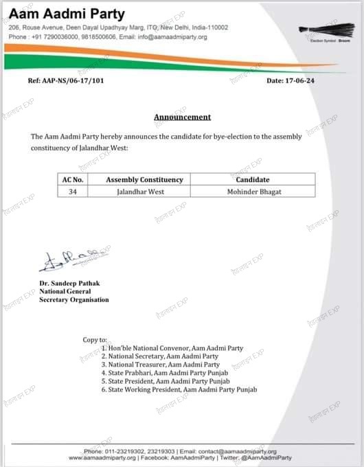 आम आदमी पार्टी ने जालंधर पश्चिम विधानसभा सीट पर होने वाले उपचुनाव के लिए मोहिंदर भगत को बतौर उम्मीदवार मैदान में उतारा है। भगत ने 2022 में जालंधर वेस्ट से भाजपा की टिकट पर चुनाव लड़ा था।