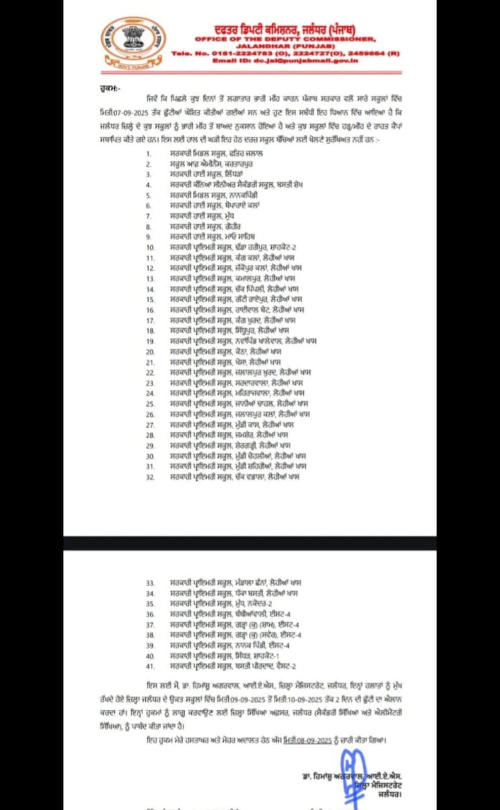 👉🏻 जिला जालंधर के 41 स्कूलों में 09 और 10 सितंबर को छुट्टी,जिलाधीश ने जारी किए आदेश
